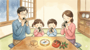 家族みんなで静かに恵方巻を食べる時間は、それぞれが自分の願いに集中できる特別な瞬間になりますよ。