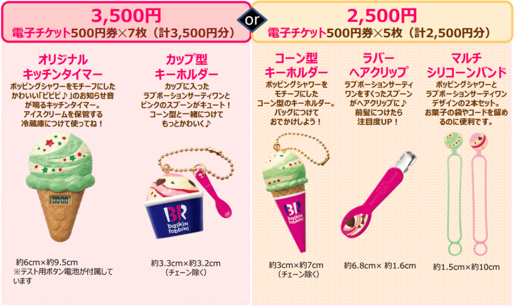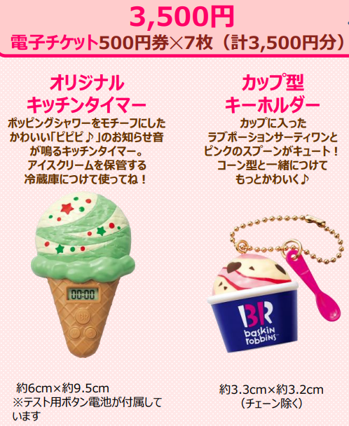 ・3,500円の福袋:電子チケット500円×7枚、オリジナルキッチンタイマー、カップ型キーホルダー