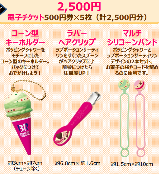 ・2,500円の福袋:電子チケット500円×5枚、コーン型キーホルダー、ラバーヘアクリップ、マルチシリコーンバンド