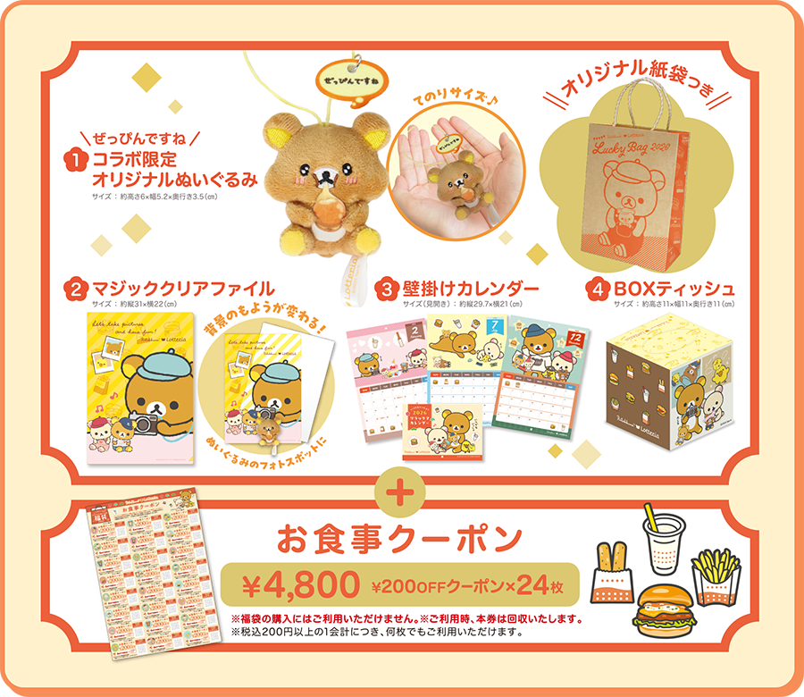 可愛いリラックマグッズと、ほぼ同額のお食事クーポンが入ったお得な福袋をゲットしましょう。