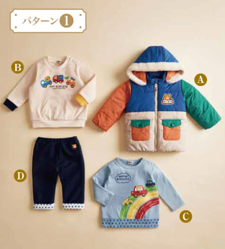 - ポイント:ミキハウス同様、はおりものが入った5点以上のセット。ダブルBならではのクールなアメカジスタイルが魅力