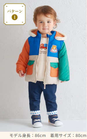この福袋の最大の魅力は「中綿ジャンパー」です。フードが取り外し可能で自宅で洗濯もできる便利なアウターに加え、トレーナー、長袖Tシャツ、パンツが各1点ずつ入っています。