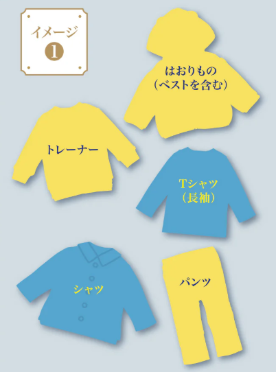 - ポイント:体温調節に便利なベストなどのはおりもの入り。アイテム数が豊富で様々な着回しが楽しめる